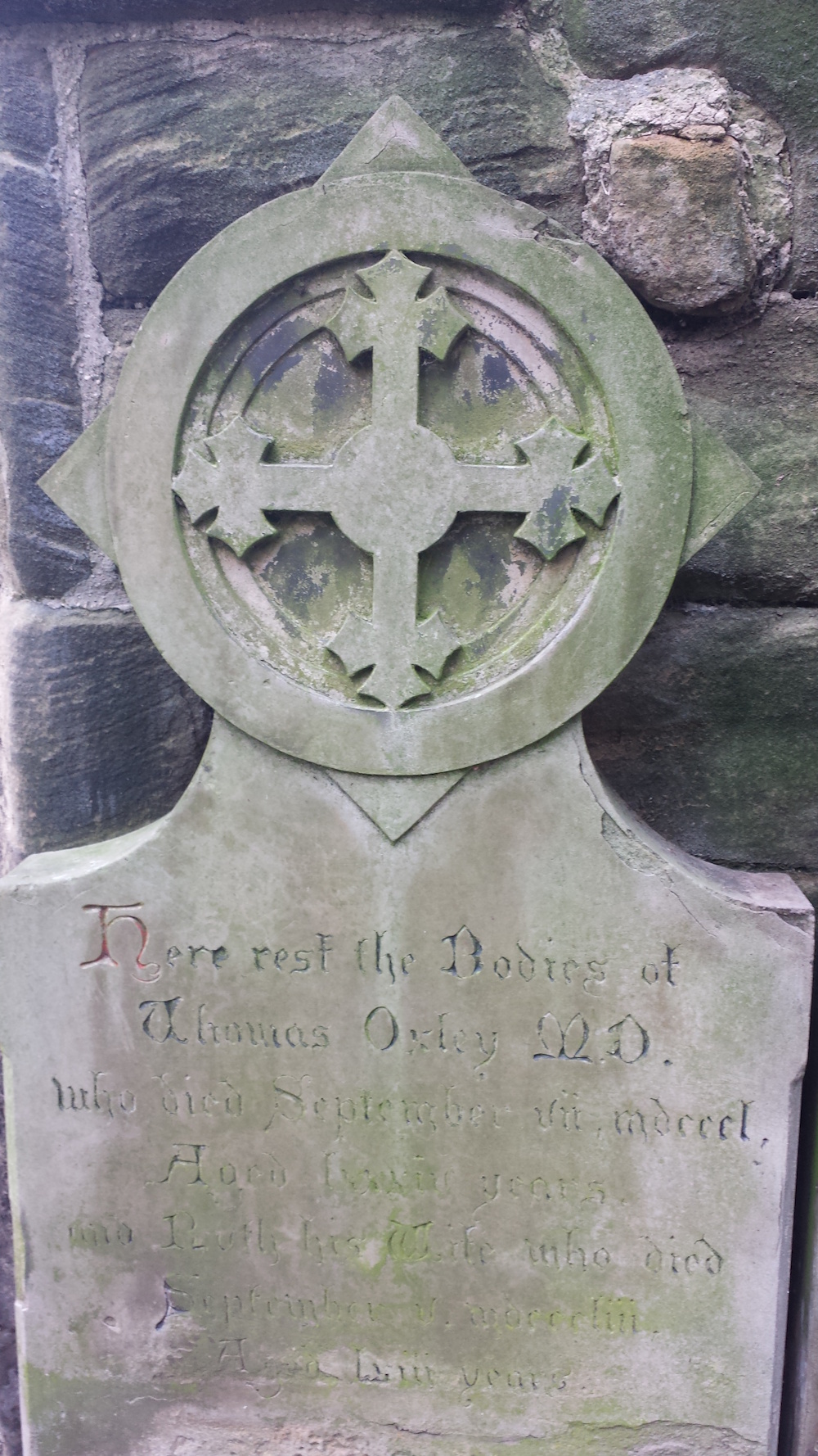 ![]() | Passion Cross carved on a 18th or 19th century grave headstone, All Saints Church, Pontefract, England. (Click photo to enlarge) Note the first carved letter; a rubricated (red) initial "H" which has survived centuries of Yorkshire weather. The paint is probably red ochre, a natural, iron-rich earth pigment. When mixed with linseed oil it is one of the most durable historic lettering paints. |