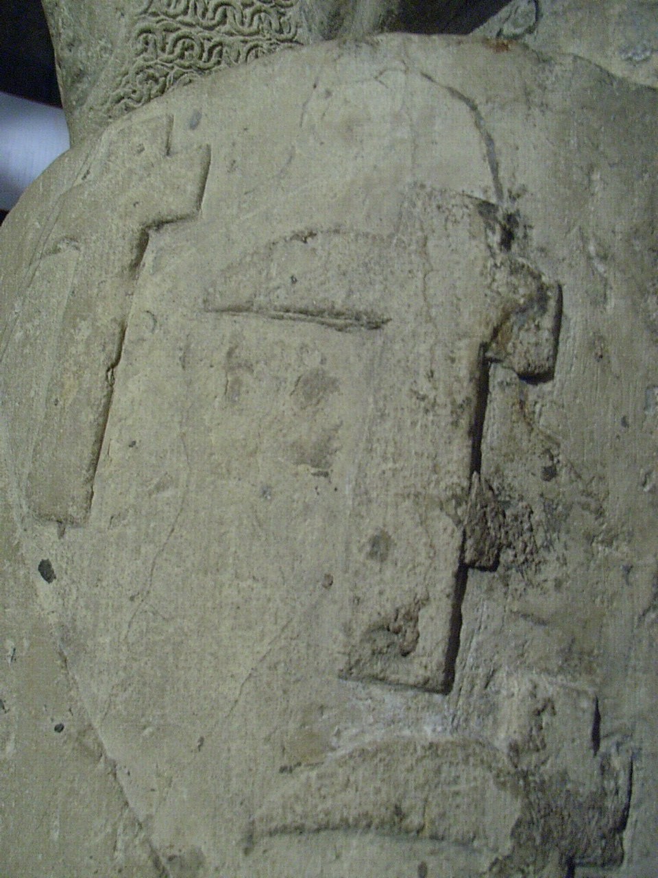 His shield bears six pickaxes. 'Six' is not understood to have any particular religious or military significance, but matches the six martlets on a tomb on the opposite side of the nave, being the coat-of-arms of Margery, Hugo's wife.