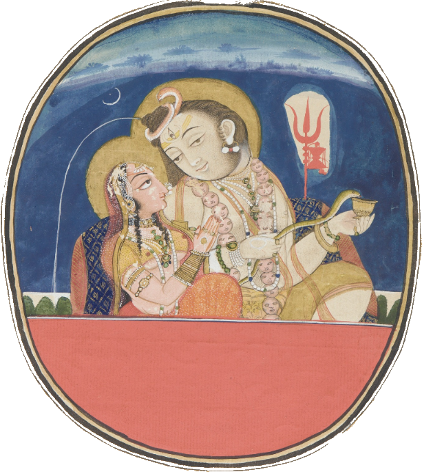 A depiction of the Hindu god Shiva with Parvati, both with a halo. Shiva has a Third Eye, a necklace made of skulls, a trident and a few snakes.